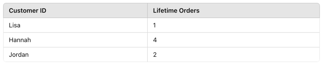 Examine the average time between orders for customers with 1 lifetime purchase (like Lisa) versus those with 4 (like Hannah). Maybe first-time buyers typically wait five months before purchasing again, while those with multiple orders re-up every two or three months.