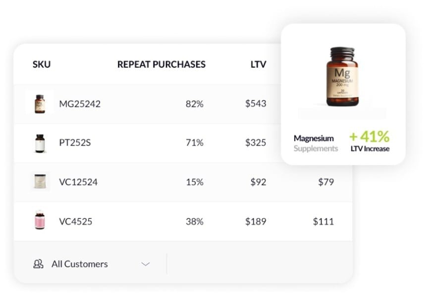 Share of orders leading to a follow-up incl. the same product (%): How many orders containing this product resulted in a repeat purchase of the same product. This metric is especially important for CPG brands such as cosmetics, food and beverage, where you want to create product loyalty.