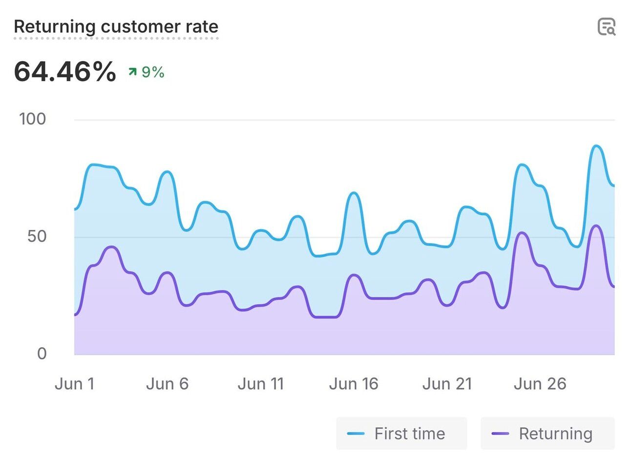 The returning customer rate (or repurchase rate) metric only tells you how many of the orders in a period came from new customers and how many came from existing customers.