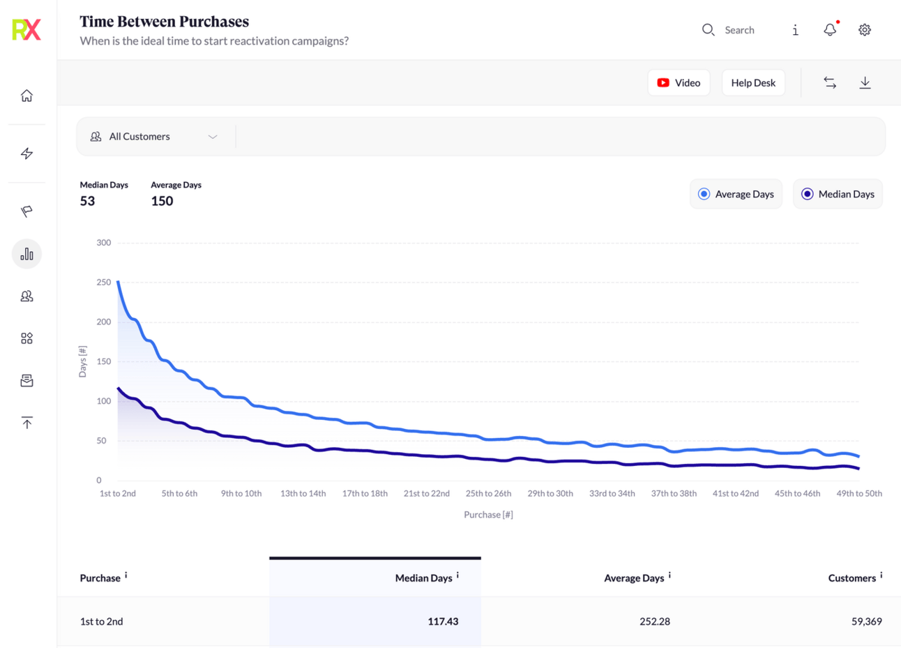Insight: Customers with a 50% higher average order value (AOV) on their first purchase make twice as many purchases over their lifetime.