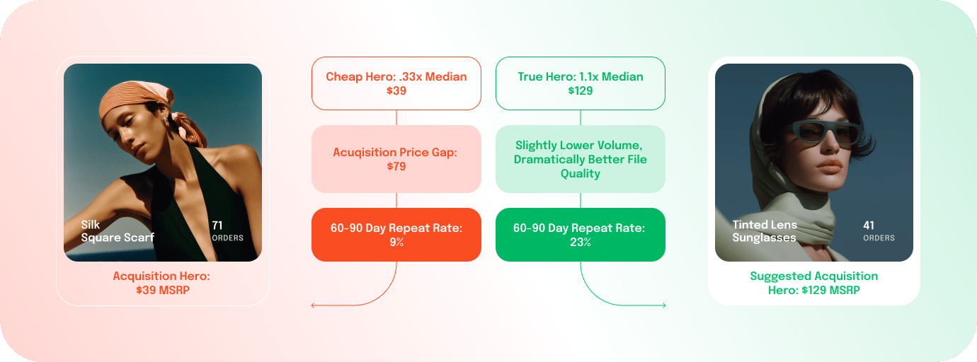 A cheap hero builds a big customer file that doesn’t compound. A median-priced hero builds a smaller file that behaves like your ideal customer and becomes dramatically easier to retain, upsell, and scale.